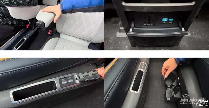 第二排的中间还有可折叠的手托,隐藏的杯架和USB充电口。