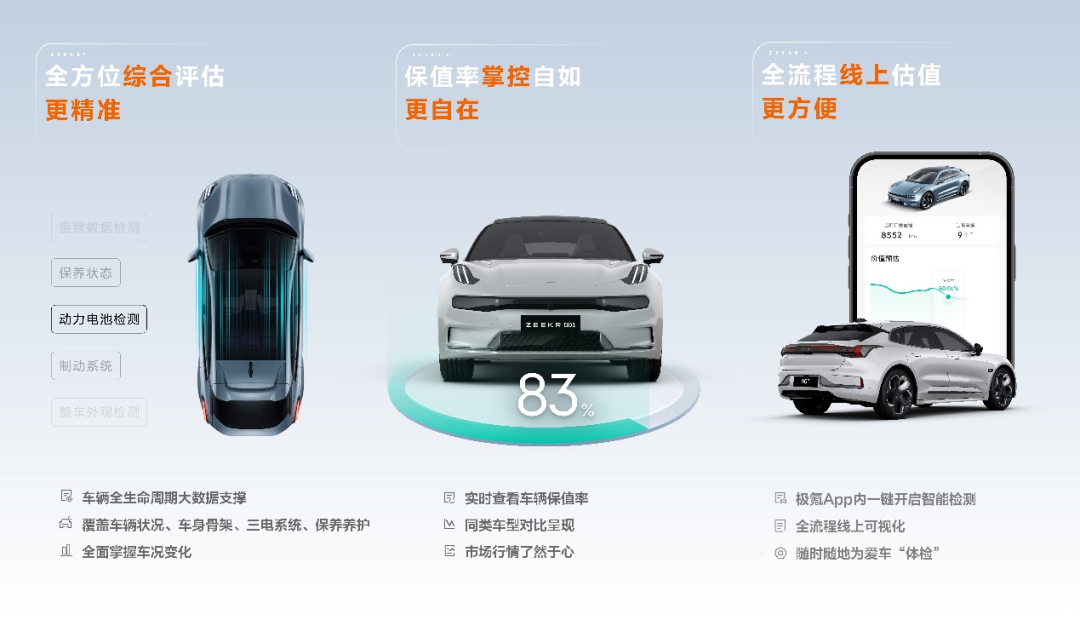 对此,极氪推出了行业首创的动态保值率线上智能评估工具,用户可在极氪App内一键开启可视化的智能检测,在线生成车辆保值率报告及市场行情参考,随时随地掌握爱车价值。