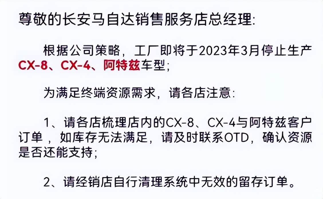 根据长安马自达向旗下的经销商发布的消息,工厂将会从3月份开始停止生产CX-4、CX-8以及阿特兹共三款车型,要求他们清点现有的库存车,看下能否满足剩下的订单。而在这三款车型宣布停产之后,马自达于国内市场上仅剩下马自达3(昂克赛拉)、CX-30、CX-5和即将上市的CX-50而已,车型产品数量相较于其余海外市场更少。