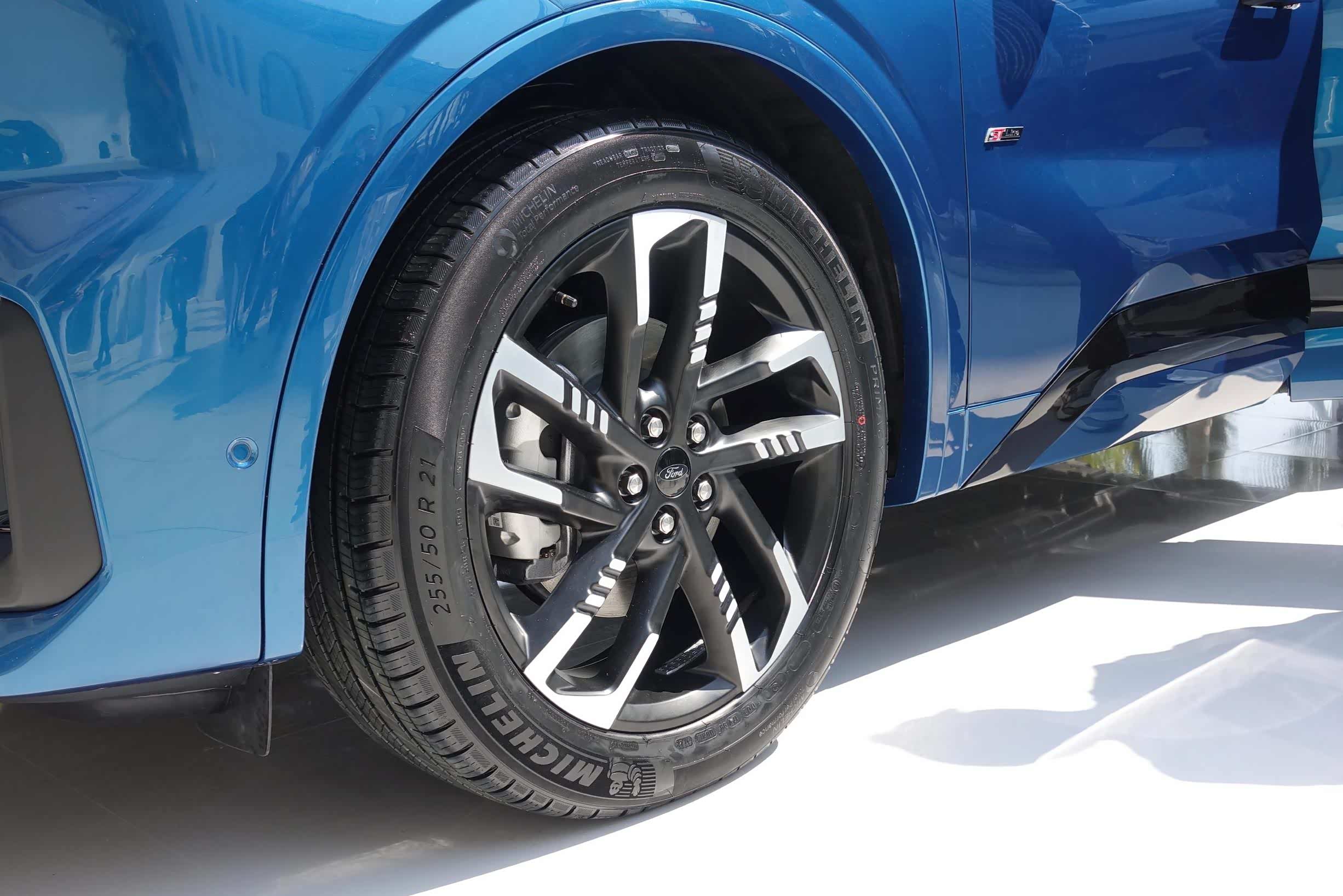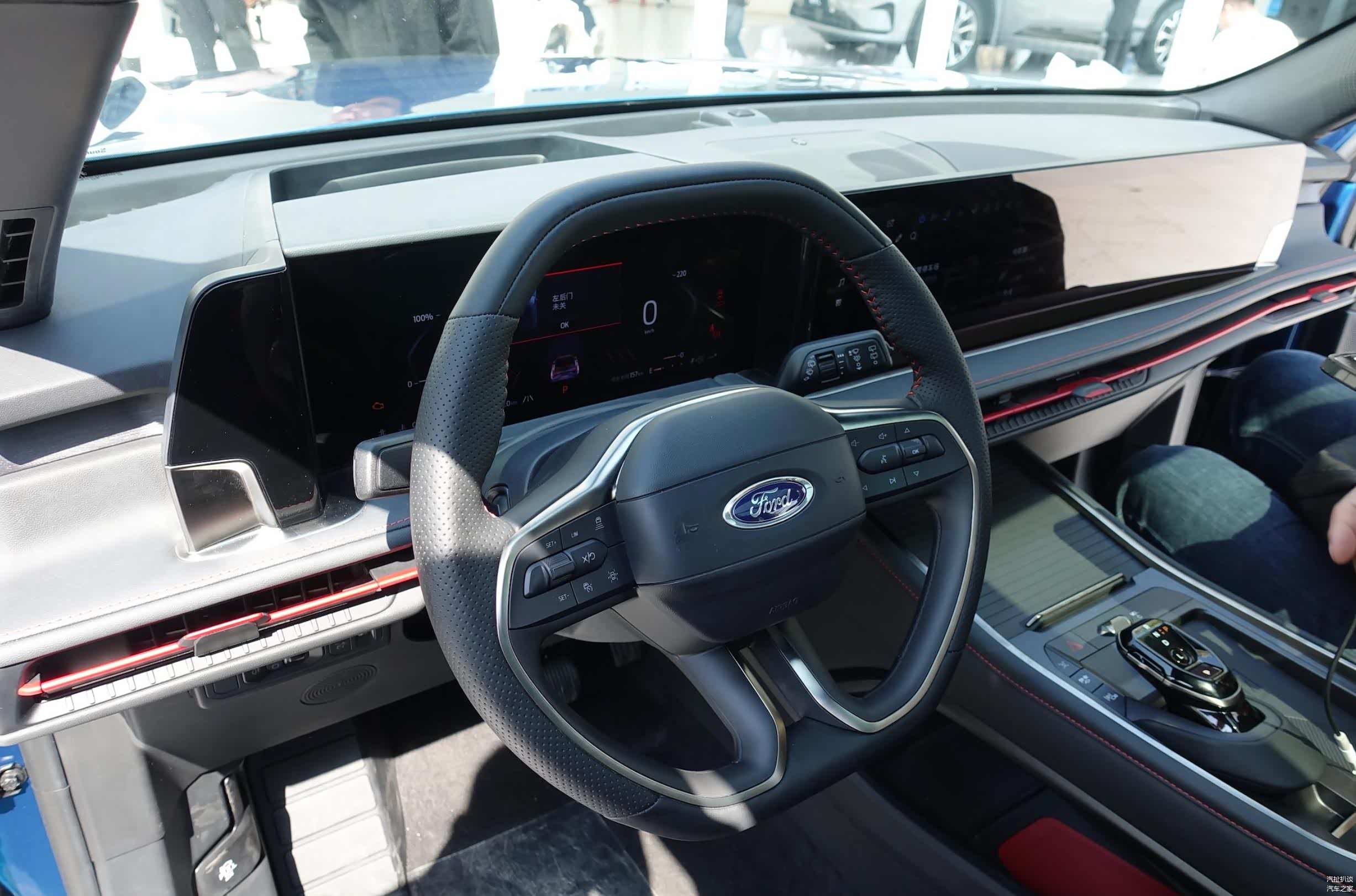 内饰方面,座舱内虽是横穿中控的布局,但12.3英寸全液晶仪表盘与13.2英寸中控屏采用分开设计,凸出的屏幕布置也让屏幕离驾驶者的距离更近,操作更加便捷。此外,新车还提供了SYNC+2.0智行互联系统、业内首创的辅助驾驶功能BlueCruise蓝智驾等智能化科技配置。