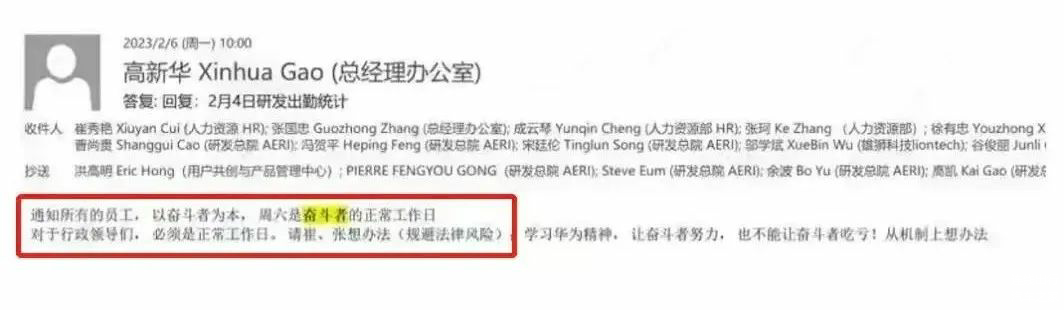从网络上流传的这封邮件来看,发送时间是上月6日,发件人署名为奇瑞总经理办公室高新华,而邮件的主要内容则是“通知所有的员工,以奋斗者为本,周六是奋斗者的正常工作日。”