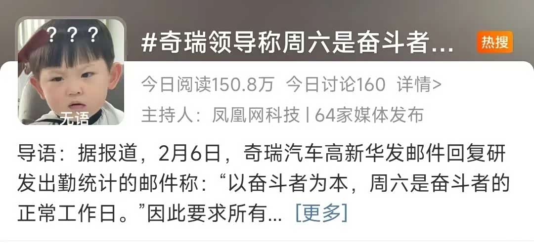 从邮件内容看,这位名叫高新华的高管或许知道强制员工周六上班是违反劳动法的,因此才会有“规避法律风险”的指示。这一邮件被曝光后,一度在网友们的吐槽下被“送”上热搜,有网友表示“奇瑞这高管是在知法犯法”。