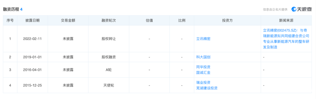 结合其融资历程来看,此番观察或有一定道理。在立讯精密入股之前,成立于2010年的奇瑞新能源共经历过3轮融资,均未公开披露金额。但间隔较长的融资时间,暗示着其向机构筹款不太顺利。