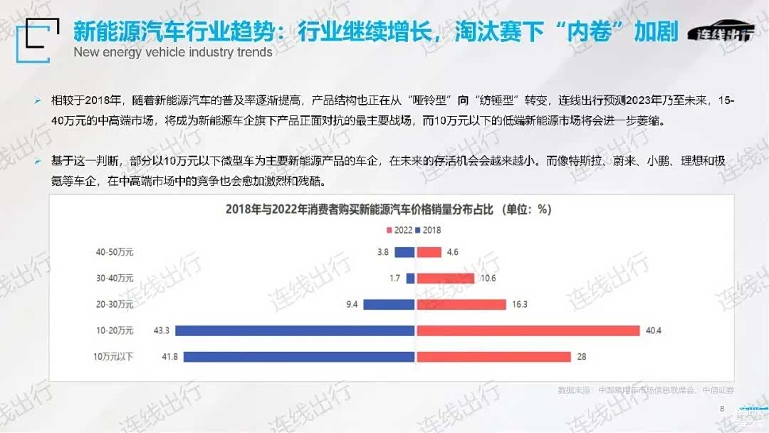 第二,10万元以下、A00级微型电动汽车市场的空间萎缩,比外界想象得还要更快些。据连线出行发布的《2023出行产业趋势报告》数据显示,2022年10万元以下A00级别车型的销量分布比例为28%,而在2018年这个数字还是41.8%。