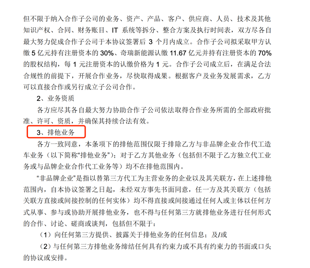 值得注意的是,在合作协议中,还包括一项排他协议——奇瑞方面不能再与其他汽车代工企业合作代工造车业务,但奇瑞可独立代工业务或与汽车品牌企业合作代工业务。也就是说,奇瑞不可与其他代工厂合作,但可以接其他车企的代工需求。