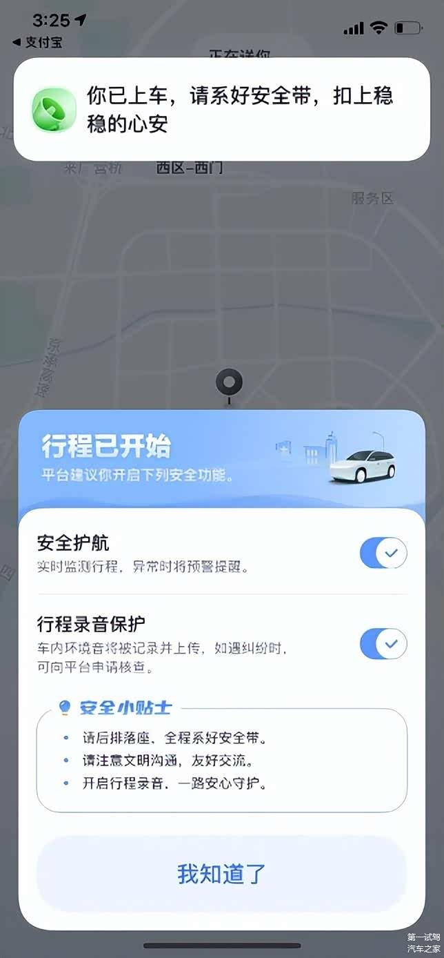“上车前,App界面会弹出乘车校验卡,让我核验车主车牌信息是否和订单一致,确认无误再点击上车。行程开始后,App会提示我开启行程录音和安全护航。同时,我还可以把我的行程分享给亲友,这样父母能及时知道我到哪了,离家还有多远”
