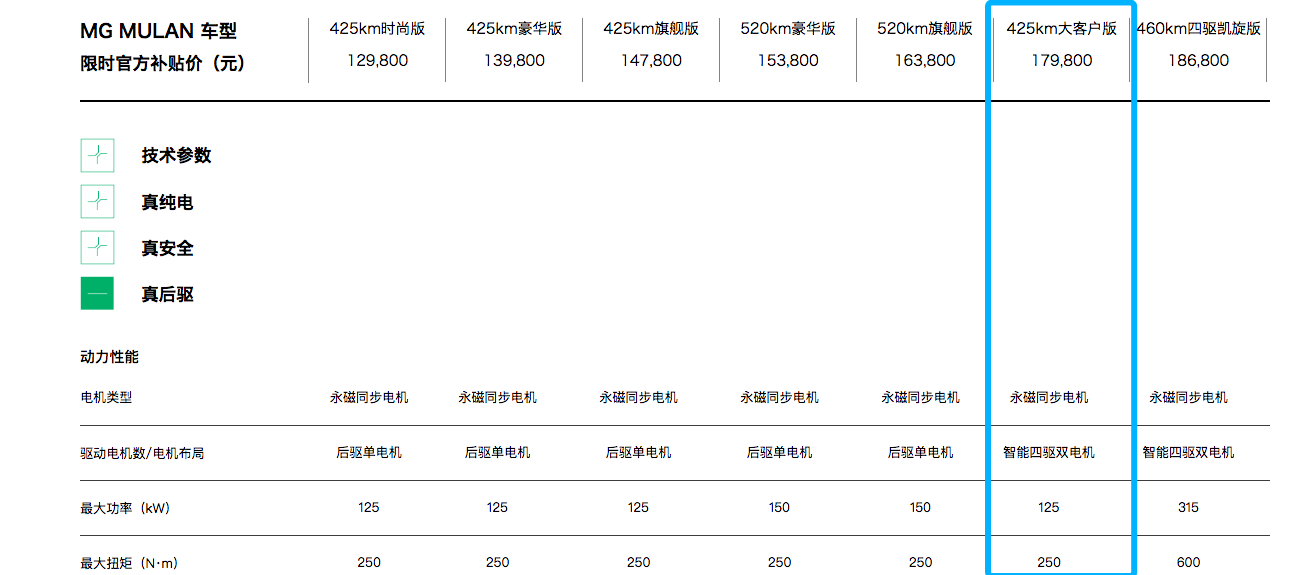 动力方面,官网显示名爵MG MULAN(图片 | 参数 | 询价)大客户版采用智能四驱双电机布局,最大功率125千瓦,峰值扭矩250牛·米,并使用51千瓦时磷酸铁锂电池作为储能装置,CLTC工况下纯电续航里程为425公里。此外,名爵MG MULAN还拥有460公里和520公里纯电版本可选。