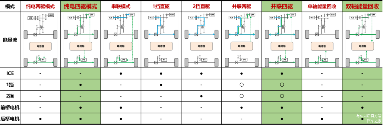 例如在市区行驶时,Hi4会在纯电两驱、串联模式、1挡直驱之间智能切换,从而避开发动机小功率低效率区间,降低能耗。当车辆处于高速巡航状态时。Hi4会自动2挡直驱模式,此时发动机工作点完全落在高效区间,且传递路径最短、效率最高。而当车辆需要高速加速超车时,Hi4则将在并联两驱、并联四驱间智能切换,保证发动机在高效区工作的同时,将系统的动力性能最大化,确保用户可以快速平稳的完成超车动作。