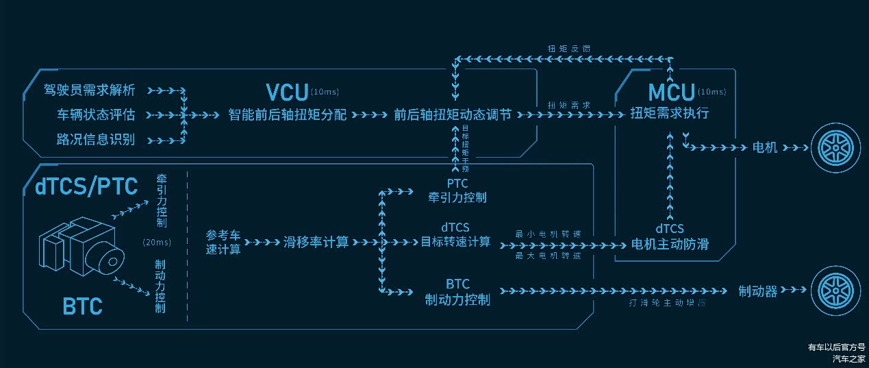 iTVC智能扭矩矢量控制,则是通过分析驾驶者动力需求、车速、驾驶模式、道路坡道、方向盘转角、电机转速、横摆角速度等驾驶员操作及车辆状态信息,融合摄像头、雷达等路况信息,智能识别不同的用车场景,进行最优的前后桥扭矩分配,全时域、全场景进行最优的前后桥扭矩分配,从而实现整车经济性、动力性及操稳性的平衡。