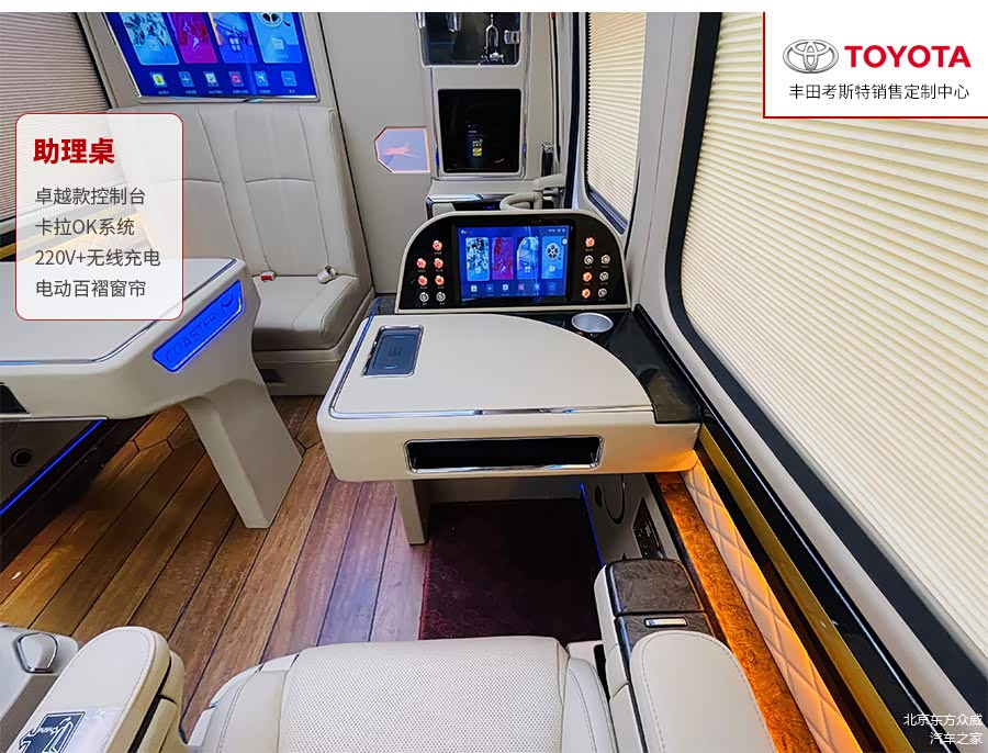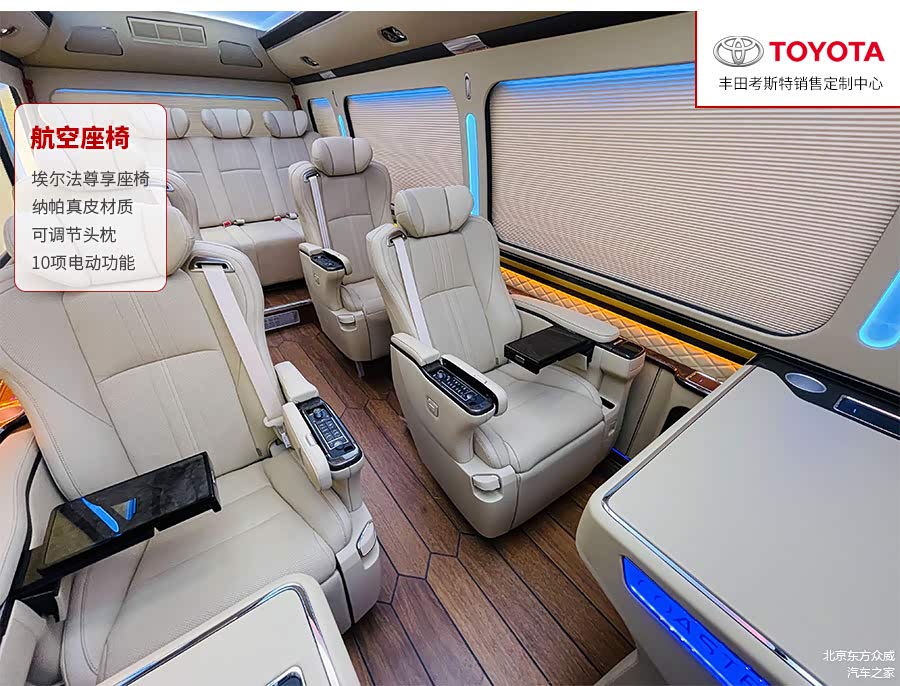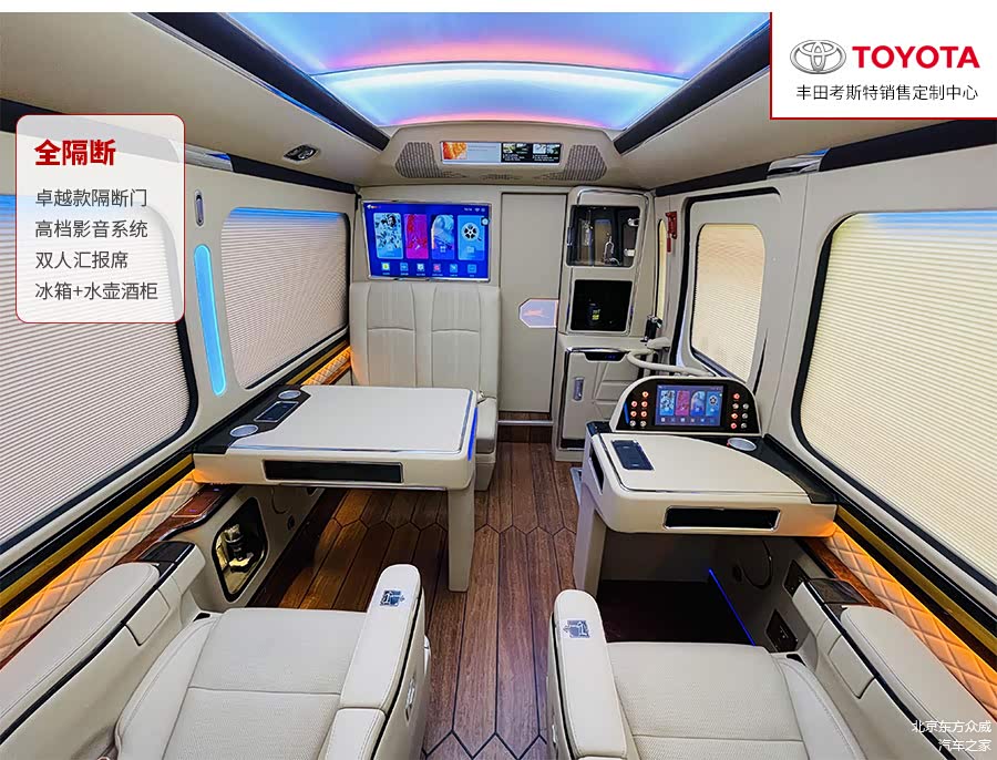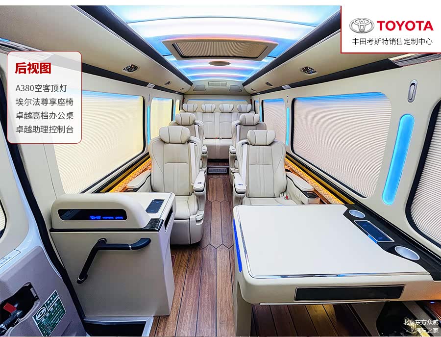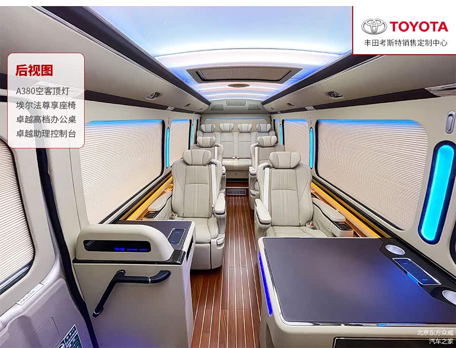 考斯特也可以作为指挥车、救护车以及明星专用的化装车等。在内饰改装方面,我们可以将考斯特原装的丝绒座椅更换成航空座椅,也可以根据内部空间加装原装进口的埃尔法座椅,提高乘坐的舒适感,当旅途劳累的时候,可以将后排的座椅放倒,变成一张电动床供我们休息。