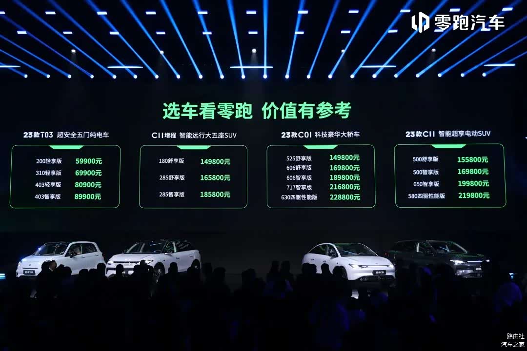 其中,2023款T03售价为5.99万~8.99万元、2023款零跑C01纯电版售价为14.98万~22.88万元、零跑C11纯电版售价为15.98万~21.98万元。
