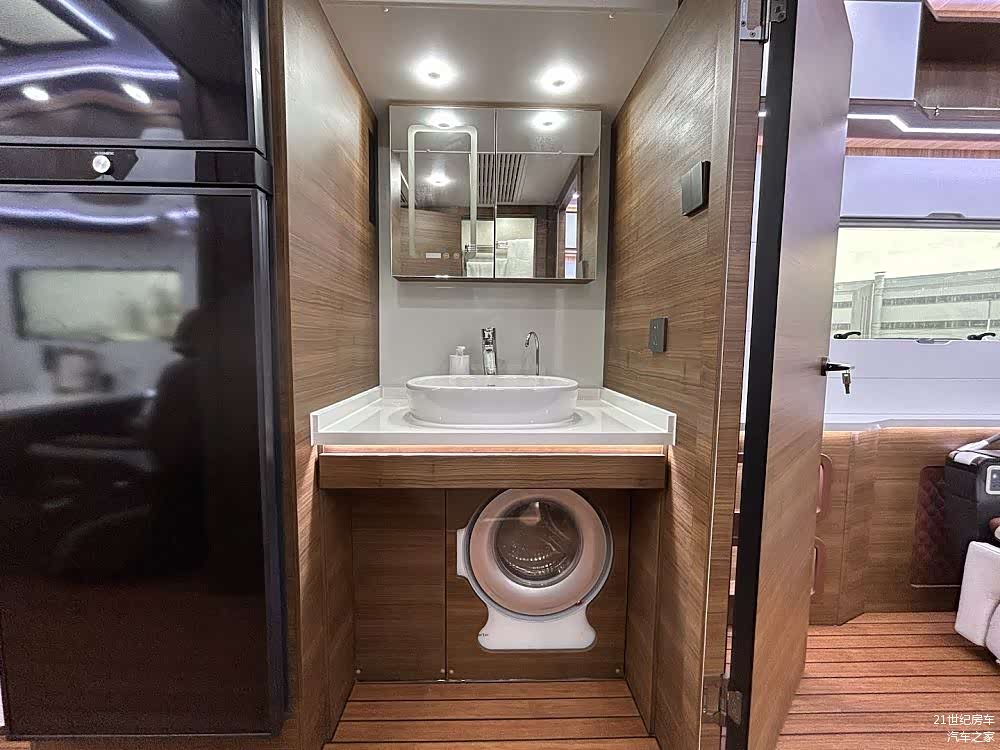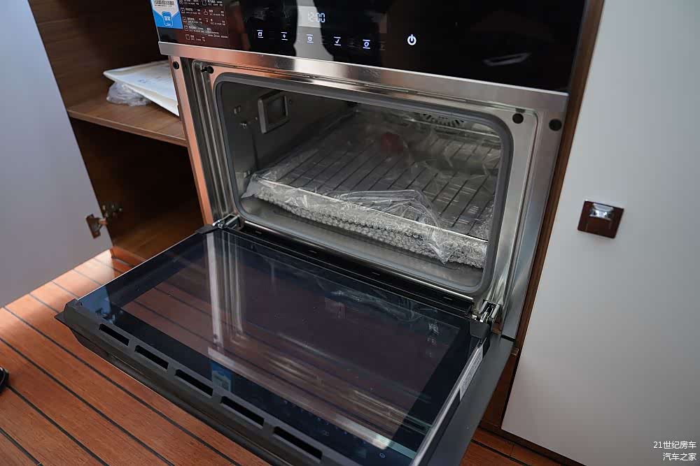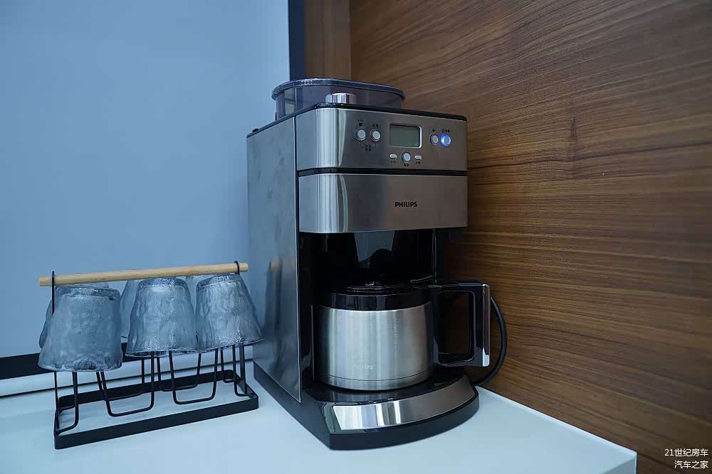 平整宽大的台面还具有不错的实用性,像224L多美达冰箱,咖啡机、蒸烤箱等在这台车上都不稀奇属于常规配置了。