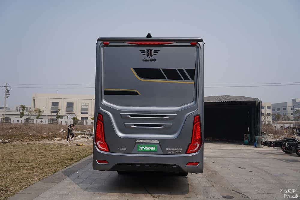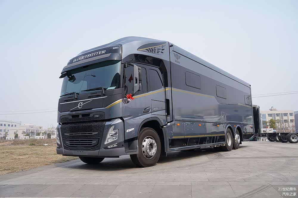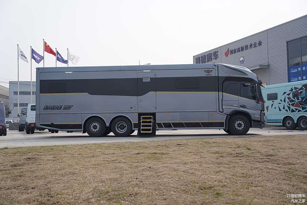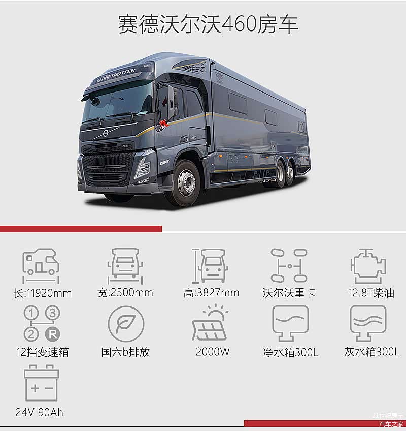 新车外观颜色采用黑灰配色,深色色调应用巨大的车身上更显霸气厚重,赛德沃尔沃460房车基于沃尔沃重卡底盘打造而来,车身尺寸11920×2500×3827(mm),将近12米的车长加上3米8的车高,聘请持有A1驾照的专职司机是必不可少的。