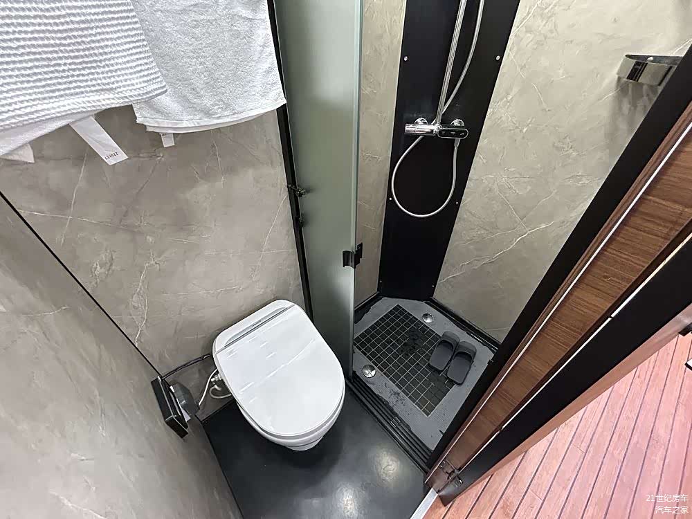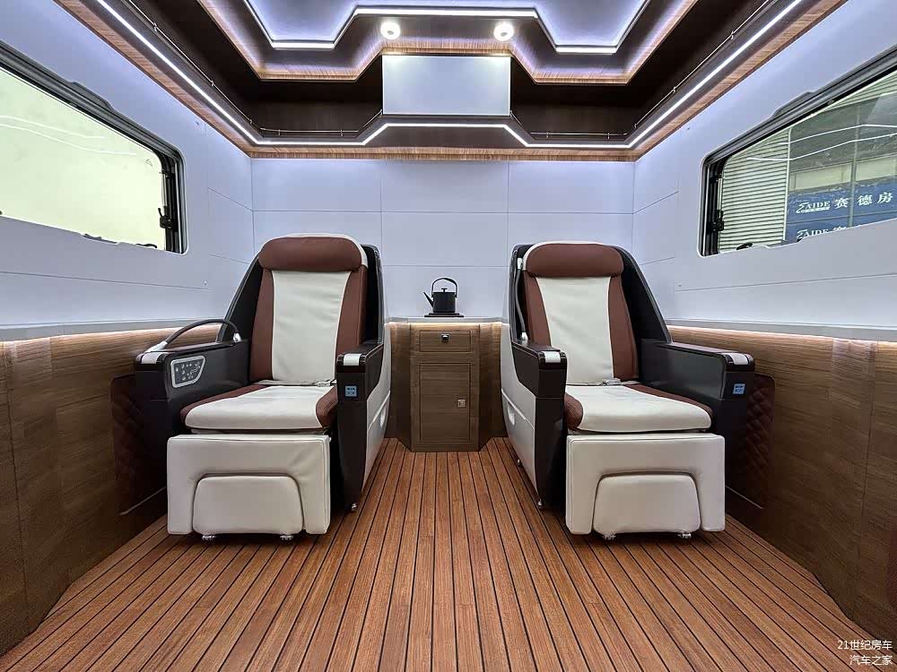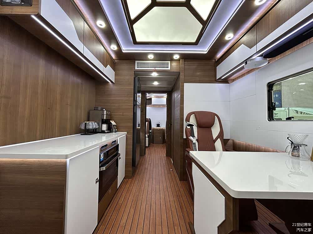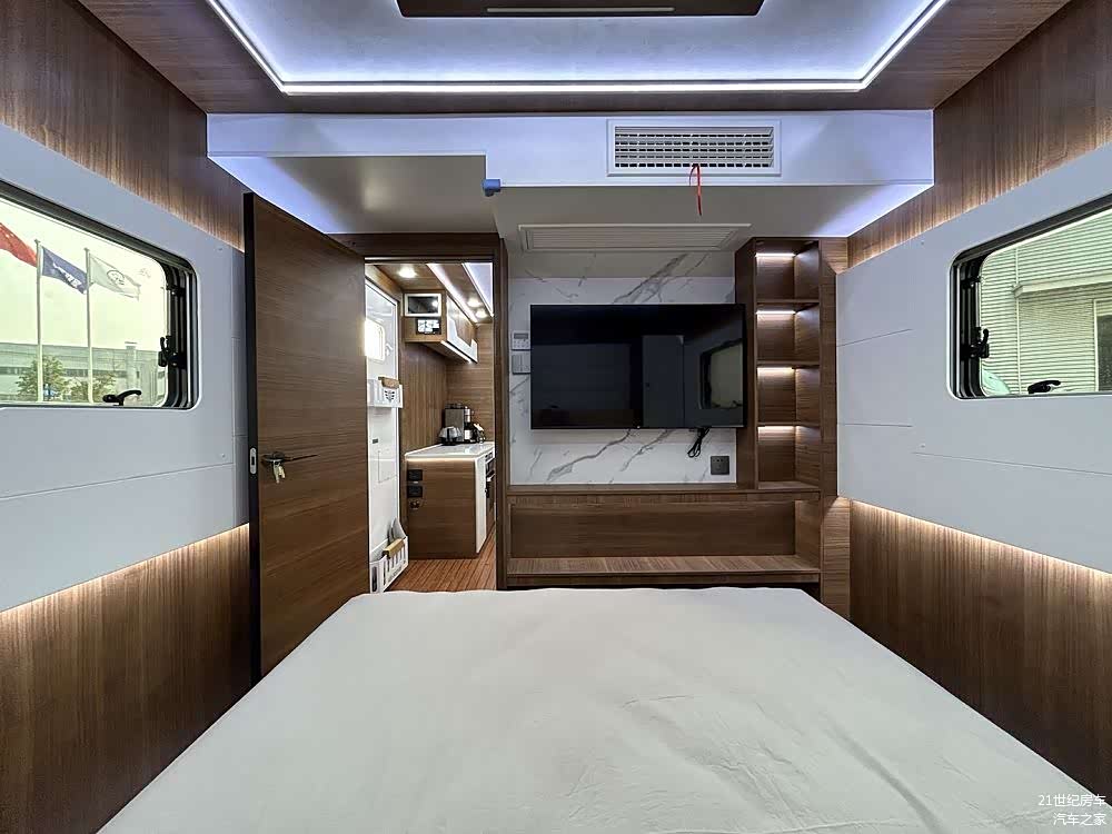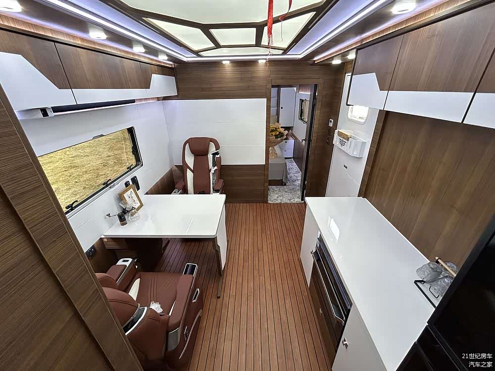 车内生活区布局更像是两室一厅一厨一卫的豪华配置,独立西厨区、空间宽敞通透的会客区、4张独立航空级座椅、游艇级实木地板、干湿三分离的卫浴洗漱区加上尾部大卧室,旅居体验直接拉满。
