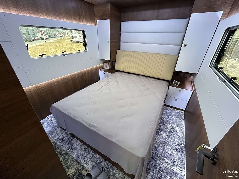 卧室区位于车厢尾部,与会客区和卫浴区相隔,保证了空间的独立性和私密性。内部配备一张1.8×2(m)的标准大床搭配慕斯床垫,提供极佳的居住睡眠体验。
