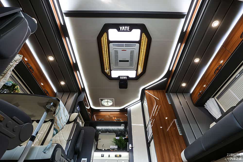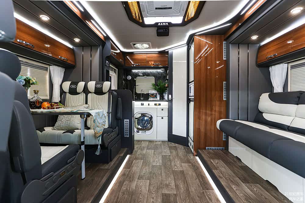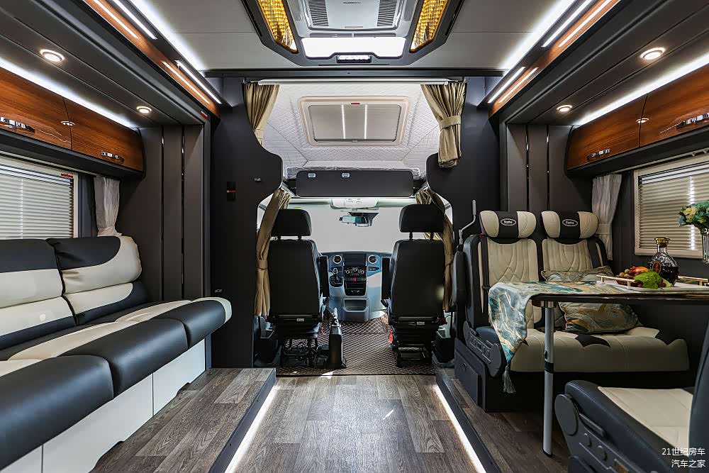车内设计风格从之前尊领DT的单一暖色调,切换为现在较受年轻人喜欢的深浅原木色配以黑白灰的轻奢路线,内部布置了足量的氛围照明加上大尺寸侧窗使得7.7㎡的主会客厅明亮通透,三人座长条沙发和四人对向卡座,可供多人同时使用。