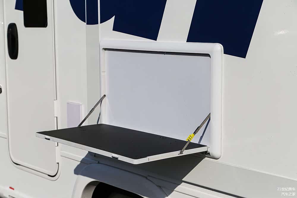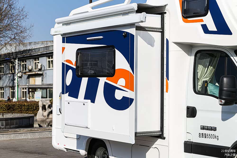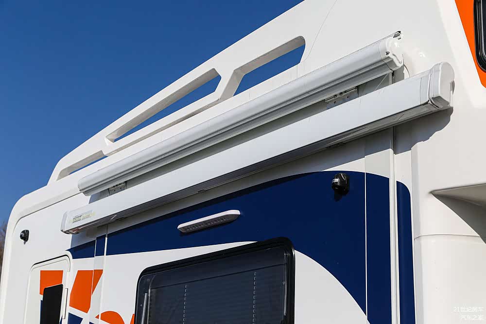 外部配置及户外套件比较丰富,包括拓展舱遮雨篷、车载曲臂式遮阳篷、户外照明灯、进口电动伸缩踏步(开门联动)、储物仓、市电接口的配置。