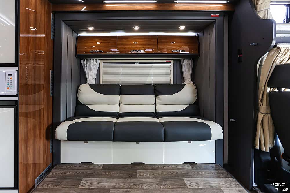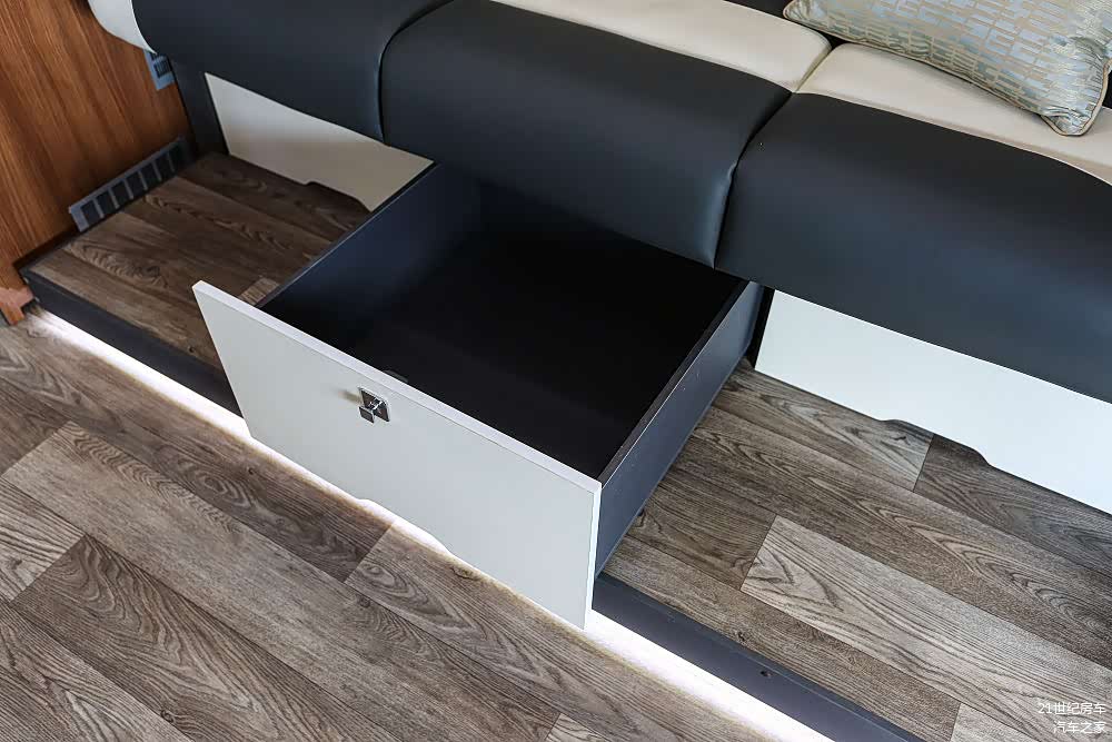 车厢左侧的长条沙发同样为折叠结构,放平后能够形成一张1.85×1.3(m)的双人床,沙发底部还巧妙地布局了三个容积可观的推拉抽屉。