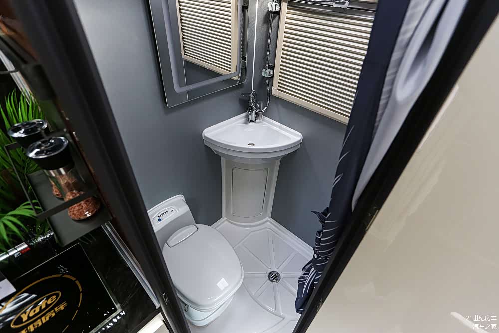 像进口抽拉盒式马桶(黑水箱 18L)、专用卫生间换气扇、集成式豪华卫浴系统、LED智能防雾浴室镜,瓷面洗手盆、防水浴帘等均有配置。