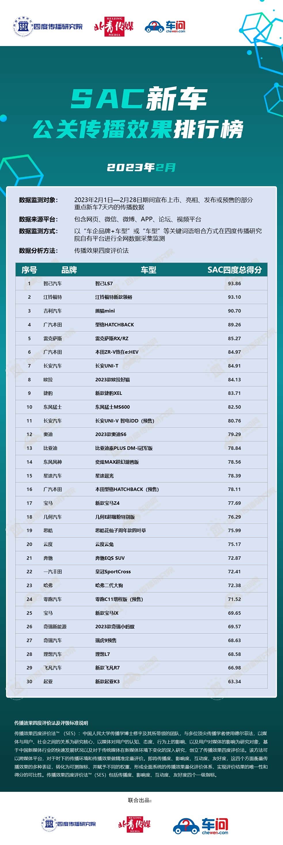 该榜单从传播声量、参与传播的媒体影响、受众互动、媒体和受众情绪倾向等多个维度对新车在7天之内的传播数据进行分析,并根据传播效果四度评价法对传播效果进行量化。