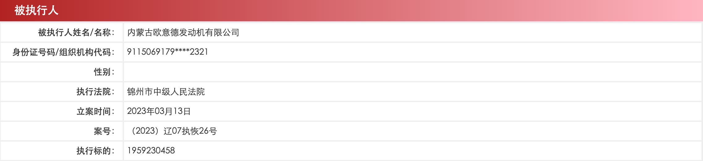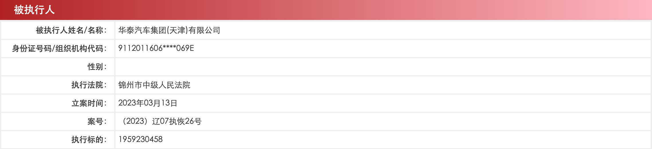 据中国执行信息公开网显示,华泰汽车集团有限公司新增恢复执行信息,执行标的19.59亿元,被执行人还包括华泰汽车集团旗下华泰汽车金融有限公司、天津恒通房地产开发有限公司、华泰汽车集团(天津)有限公司、内蒙古欧意德发动机有限公司等,执行法院为辽宁省锦州市中级人民法院。