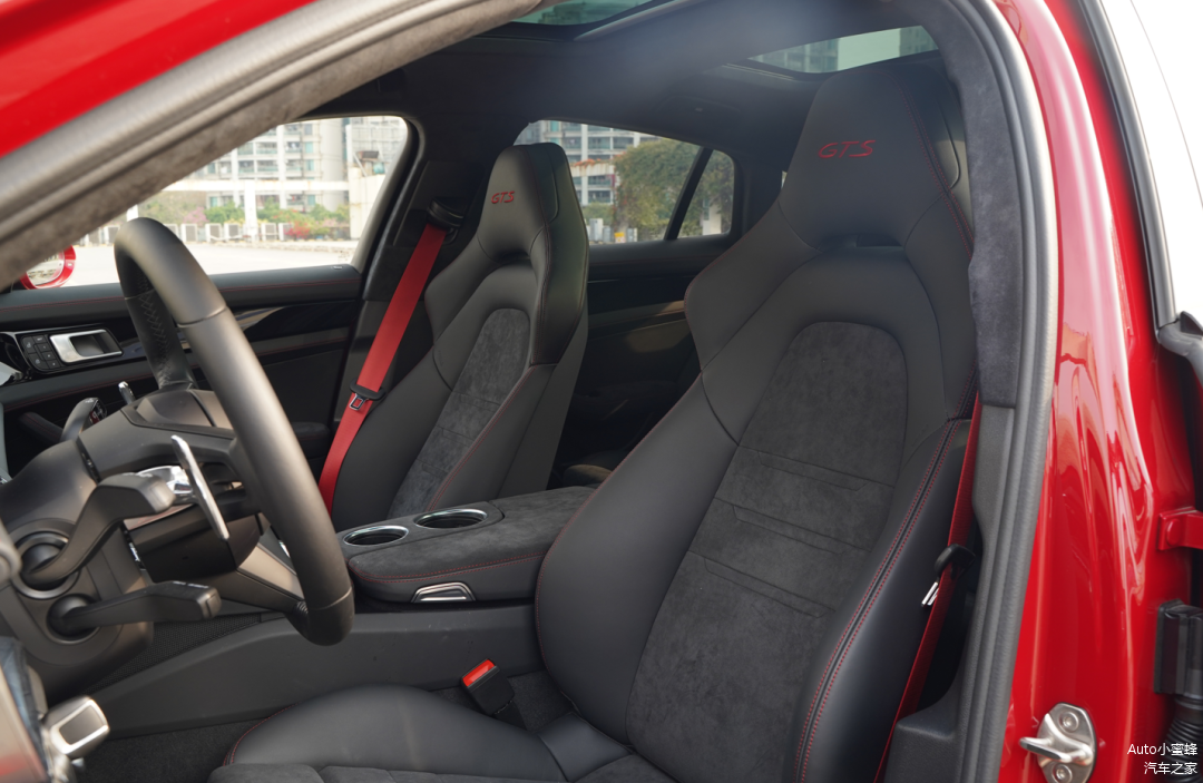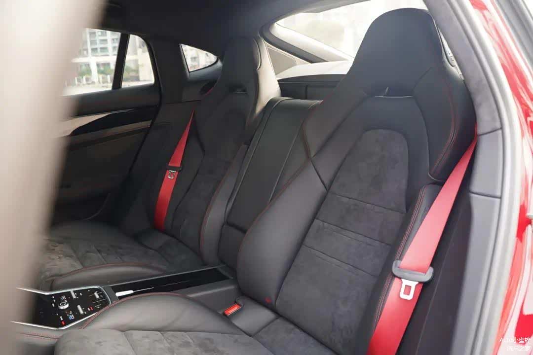 前排座椅亮点十足,首先,其调节功能非常全面,提供了18向全电动调节,可满足不同身材消费者。其次,座椅采用了真皮+Alcantara材质,档次感十足,同时该座椅没有一味的追求“性能”,乘坐起来还算比较舒适,并且坐垫和靠背的包裹性较强,头枕上方也印有“GTS”标识,彰显身份不同。配置上还提供了三挡座椅加热功能。