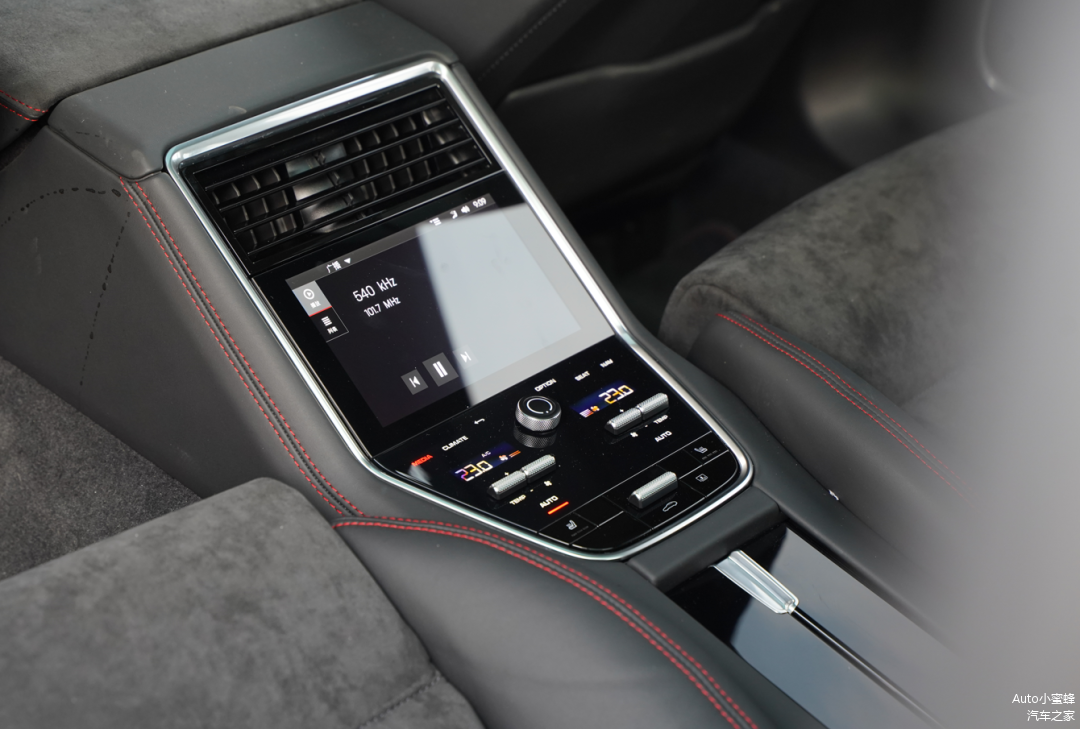 保时捷Panamera GTS空调采用了触控+按键形式,前排挡把两侧物理按键非常精致,且十分紧致,没有松垮的感觉。中控屏当中不仅能够调节气流方向,还可调节气流强度,其提供三种模式,分别为强劲、适中以及轻柔。