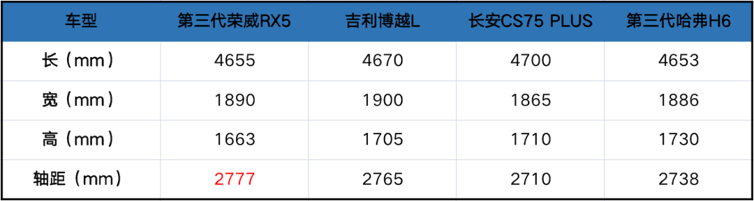 我还想啰嗦一点,四款车型的车身尺寸都差不多,但全新第三代荣威RX5的比例是最协调的。车身最长的是长安CS75 PLUS,轴距最短的也是长安CS75 PLUS,结果就是前后悬过长,这不是汽车设计的完美比例。