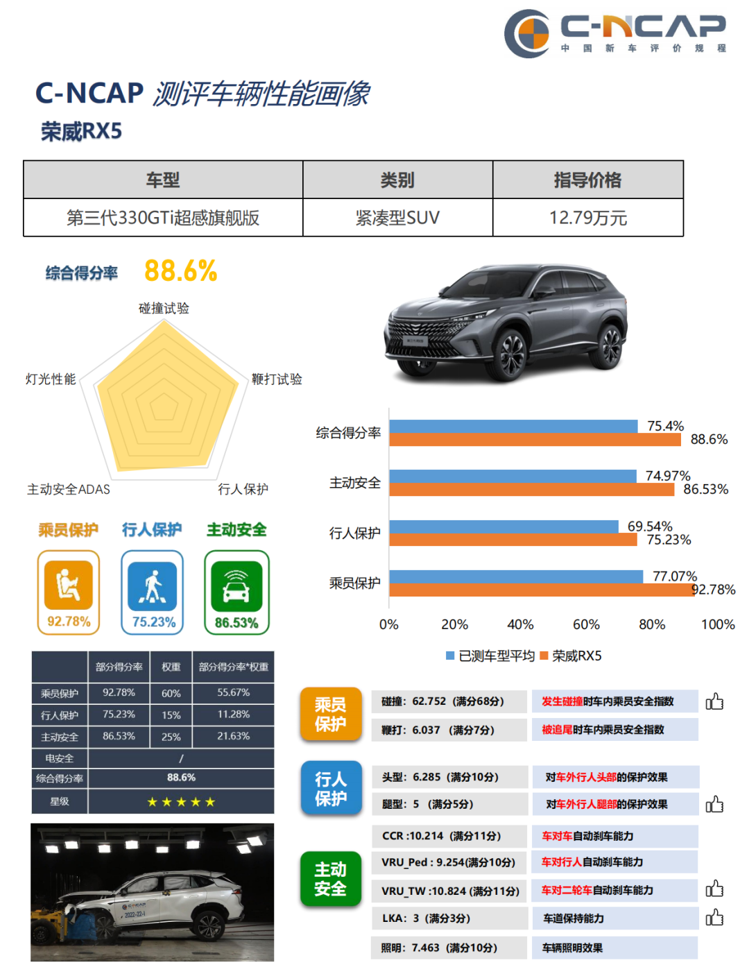 诞生自上汽珠峰架构的全新第三代荣威RX5,采用超高强度笼式车身,整车高强度钢占比高达79%,带来同级最强车身强度。全新第三代荣威RX5以88.6%的综合得分率,获C-NCAP五星评级。同时,满足C-IASI中国保险汽车安全指数优秀标准。