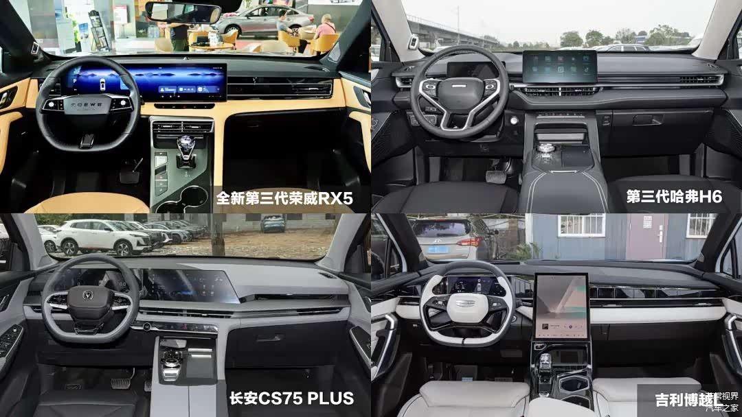进入车厢内,4款车型均采用的大量横直的线条,以营造出舒展的氛围。4款车型当中,吉利博越L和长安CS75 PLUS的科技感是最强的,哈弗H6则显得廉价,而全新第三代荣威RX5强调的是居家的温馨、豪华质感以及可见的科技。