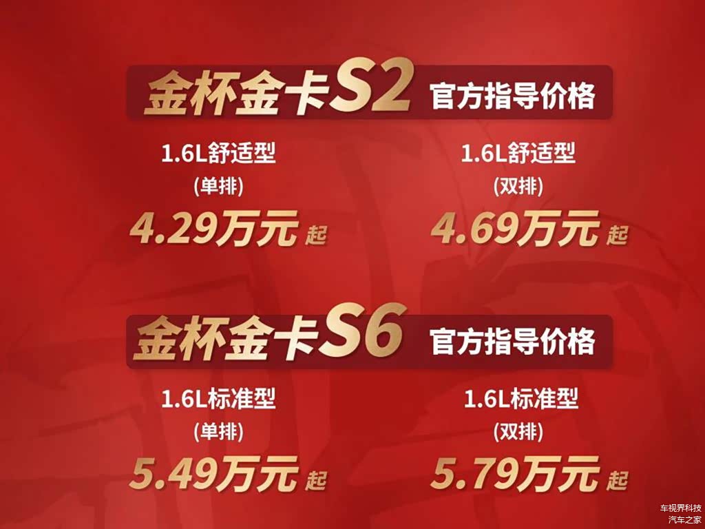3月21日,鑫源金杯品牌旗下两款旗舰型微卡 金杯金卡S2(图片 | 参数 | 询价)/S6正式上市,两款新车共推出4个配置,其中金杯金卡S2舒适型单排售价4.29万,双排售价4.69万,定位是“节油王”。金杯金卡S6标准型的单排售价5.49万,双排售价5.79万。定位“重载王”。