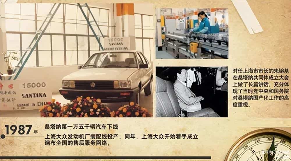 1987年,上海市政府将汽车工业列为上海第一支柱产业,成立了“支援上海大众建设小组“和“桑塔纳国产化办公室”。同年,桑塔纳第15000台车下线,上汽大众发动机厂装配线投产。