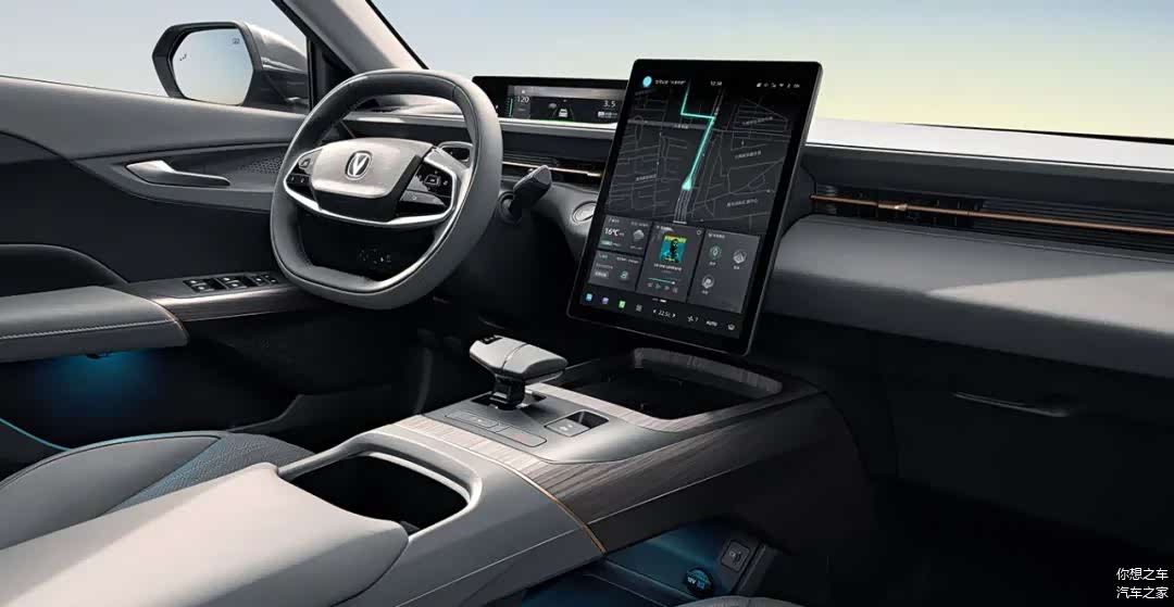 内部的设计风格,和当前主流的新能源车相似,小屏仪表+大屏中控,配置上标配了皮座椅、语音控制、电子挡把等。