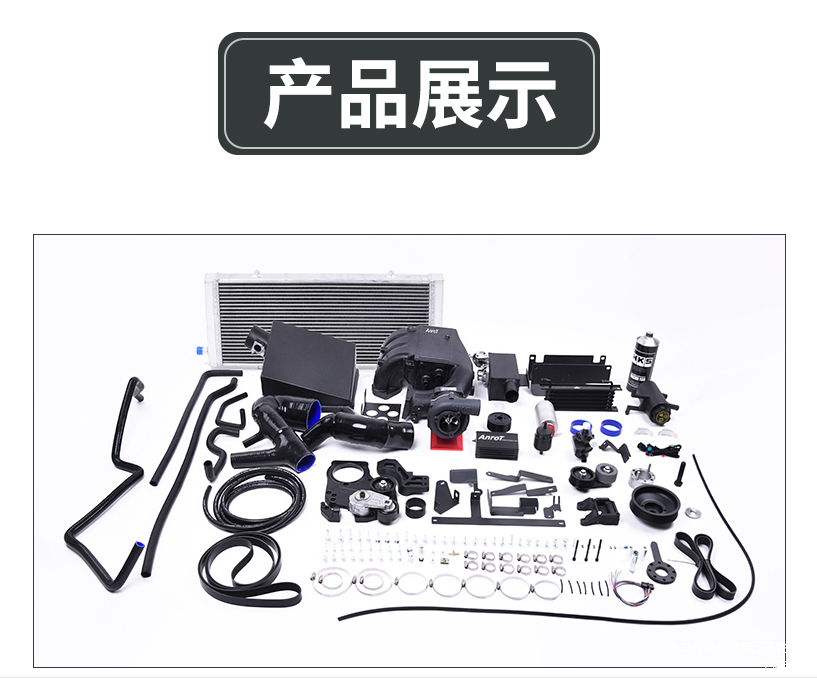 ANROT/HKS机械增压套件清单:HKS机械增压器本体、油壶、油滤、油冷器、油管、润滑油、空气冷却水箱、空气水冷散热器、水管、水泵、进气管路、泄压阀、外挂电脑、程序、线束、CNC增压器支架以及附件定制支架。