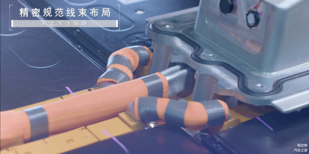 第四、精密规范线束布局:超安全线束,覆盖完整,防止碰撞时发生短路;高压线集成后置,高压线集成连接口置于动力总成后面,设保护装置,最大限度避免撞击时损伤高压线、引发短路等情况;