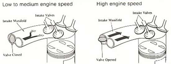 中低转时,八条进气道阀门关闭一半,免得醉氧头晕跑不动。高转就全部阀门打开,让引擎多吸气,全速运转。