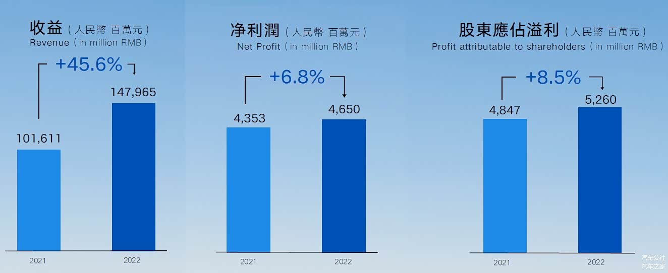 这个数字是吉利2022年的营收和利润。前者增长了45.5%,后者增长了9%。