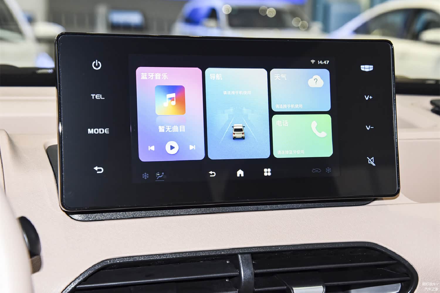与宏光MINIEV不同,熊猫mini车内中控部分有着8英寸的悬浮式显示屏,该屏带有多媒体系统,支持手机互联、蓝牙音乐。最关键的是,它还具备手机感应解锁功能,只要先下载安装相应的APP程序,车主的手机也可以成为车钥匙,科技感瞬间陡增。