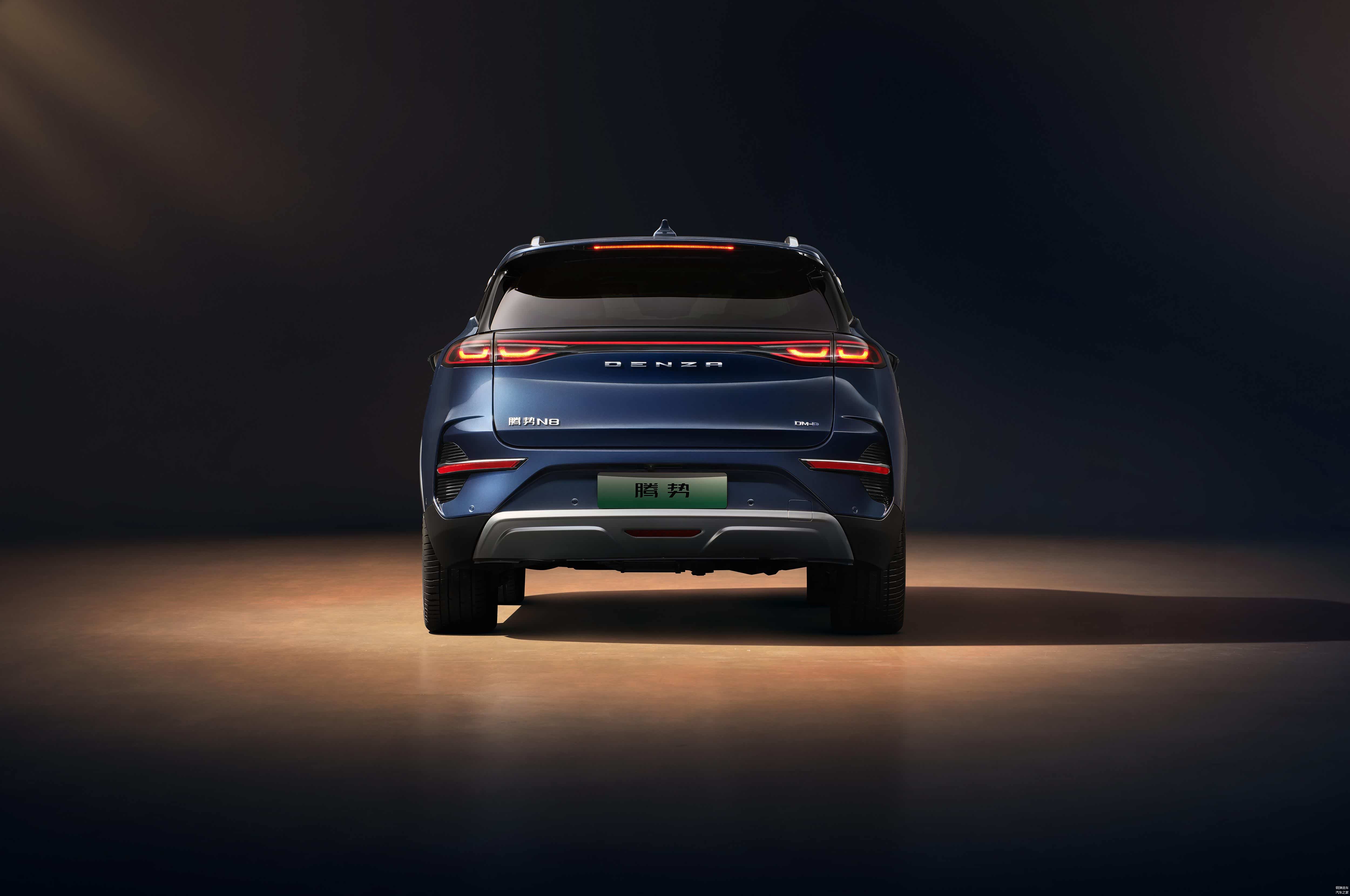 车尾整体造型宽阔饱满,横向配有凹凸筋线,彰显出了力量感。尾部灯光配置齐全,尾翼上面有长条形刹车灯,中间配有腾势全新独创的“Π”型灯组和贯穿式灯带,后杠两侧有条形反光灯。