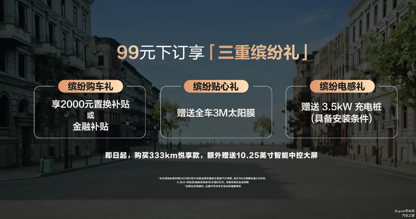上市之际,五菱官方为用户诚意准备三重“缤纷礼”,包括缤纷购车礼:享2000元置换补贴或金融补贴;缤纷贴心礼:赠送全车3M太阳膜;缤纷电感礼:赠送3.5kW充电桩(具备安装条件);购买333公里悦享款,额外赠送10.25英寸智能中控大屏。