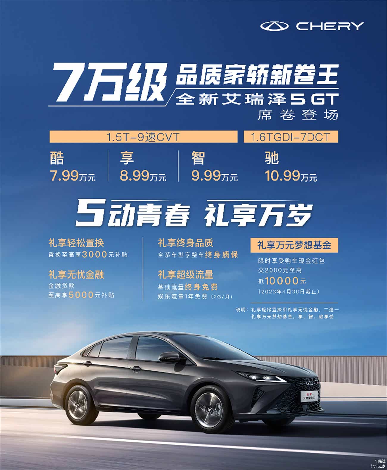 3月28日,艾瑞泽5上市七周年之际,举办了盛大的粉丝庆典,回望过去的同时,奇瑞再次为年轻人带来更好的礼物——7万级品质家轿新卷王——全新艾瑞泽5 GT正式上市,推出1.5TCI-9速CVT、1.6TGDI-7DCT两种动力,共四个版型,售价7.99万元-10.99万元。凭借“十大全系标配”,从颜值、安全和驾享全面开卷,以“超级品价比”再次席卷A级家轿市场。