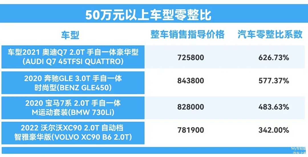 所谓零整比则是市场上车辆全部零配件的价格之和与整车销售价格的比值。假设一台销售价格为20万元的车,其零整比系数为300%,意味着消费者要换完所有的零件需花费60万元。零整比系数越低,一定程度上反映其零配件更便宜、价格更透明。