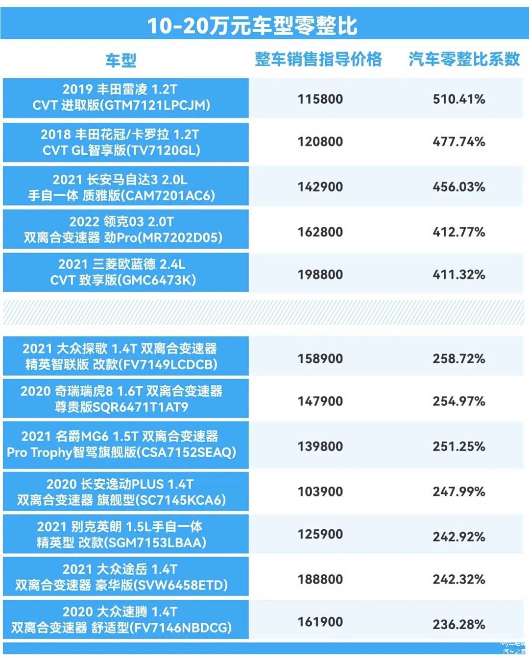 同样,合资品牌在10-20万元的价格区间,汽车零整比系数也是偏高,尤其是日系品牌,排在前五名的分别是丰田雷凌、丰田花冠/卡罗拉、长安马自达3、领克03和三菱欧蓝德。其中,雷凌凭借510.41%的汽车零整比系数排在第一位,常用配件负担指数达到了较高的18.07,但由于其故障率比较低,消费者不会感觉到这是一款高零整比的车型。