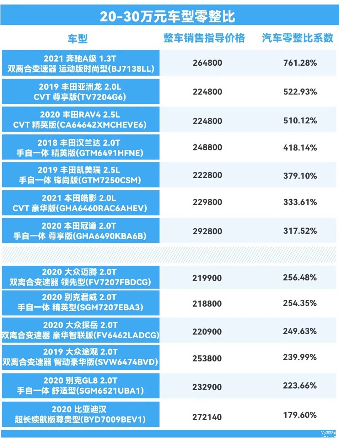 来到20万到30万元的价格区间,北京奔驰A级虽然是品牌的入门级车型,但其汽车零整比系数以761.28%高居首位,而亚洲龙、RAV4荣放、汉兰达和凯美瑞四款丰田车型紧随其后。