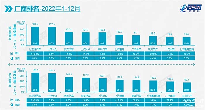 具体来看,2022年我国新能源汽车产销连续八年位居全球第一。其中,比亚迪以全年累计销售180.25万辆成绩,连续十年收获中国新能源汽车销量第一,市占率达27%,同比增长近10个百分点。