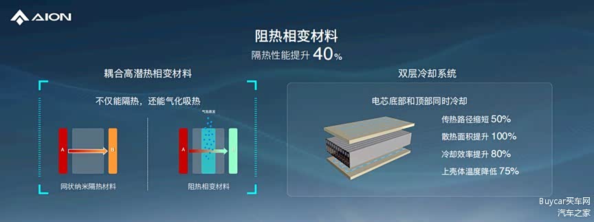 第二,埃安与中国航天合作开发了拥有隔热和相变吸热双重功能的阻热相变材料。这种相变材料的相变潜热相对常规材料提升了10倍,能在温度维持不变的基础上吸收大量的热量,配合网状纳米隔热材料,整体的隔热性能大幅度提升40%。同时,弹匣电池2.0采用了双层冷却系统,对电芯顶部和底部同时进行冷却,整体冷却效率可提升80%,同时还降低了75%的上壳体温度,进一步保障了电池包上方乘员的安全。