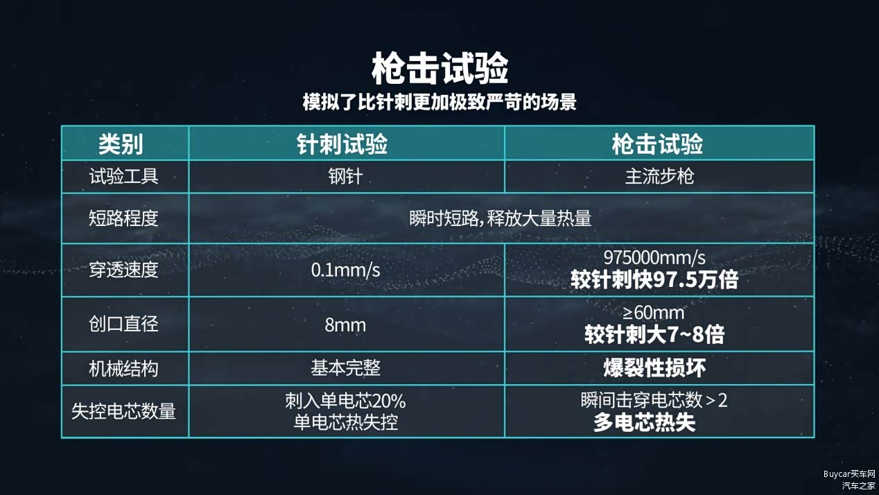 对于电池安全实验,大众熟知的是针刺实验,而此次的枪击实验是在15米处对预留射击开口的满电电池整包进行射击,当子弹穿透电芯时,速度可达针刺的97.5万倍,创口直径是针刺的7-8倍,可瞬间击穿多个电芯并造成热失控和爆裂性破坏,可以说是目前最严苛的电池安全实验。此前,磷酸铁锂单体电芯和磷酸铁锂模组在这种实验中均发生了明显的热失控和燃烧现象。因此,有人说,从针刺到枪击,堪比从冷兵器时代走向了热兵器时代。