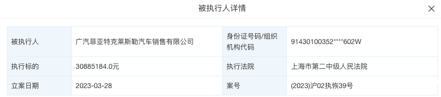 3月28日,《汽车行业关注》从天眼查信息了解,广汽菲亚特克莱斯勒汽车销售有限公司(下称“广汽菲克”)新增一则恢复执行信息,执行标的3088万余元,该案于去年11月首次执行,执行法院为上海市第二中级人民法院。