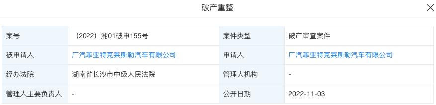 2022年合资品牌的日子普遍不好过,其中在华成立12年的合资车企“广汽菲克”破产成为标志性事件。2022年10月31日,Stellantis集团与广汽集团向法院申请广汽菲克破产,11月3日,天眼查信息显示,广汽菲克新增破产审查案件,申请人为上述公司,经办法院为湖南省长沙市中级人民法院,意味广汽菲克正式申请破产重整。11月31日,广汽集团发布公告,广汽菲克破产清算申请已获法院受理,长沙市中级人民法院认为,广汽菲克的实际资产已无法清偿全部债务,且现已基本停止经营,明显缺乏清偿能力,符合企业破产法规定的破产原因,广汽菲克据此申请破产清算依据充分。