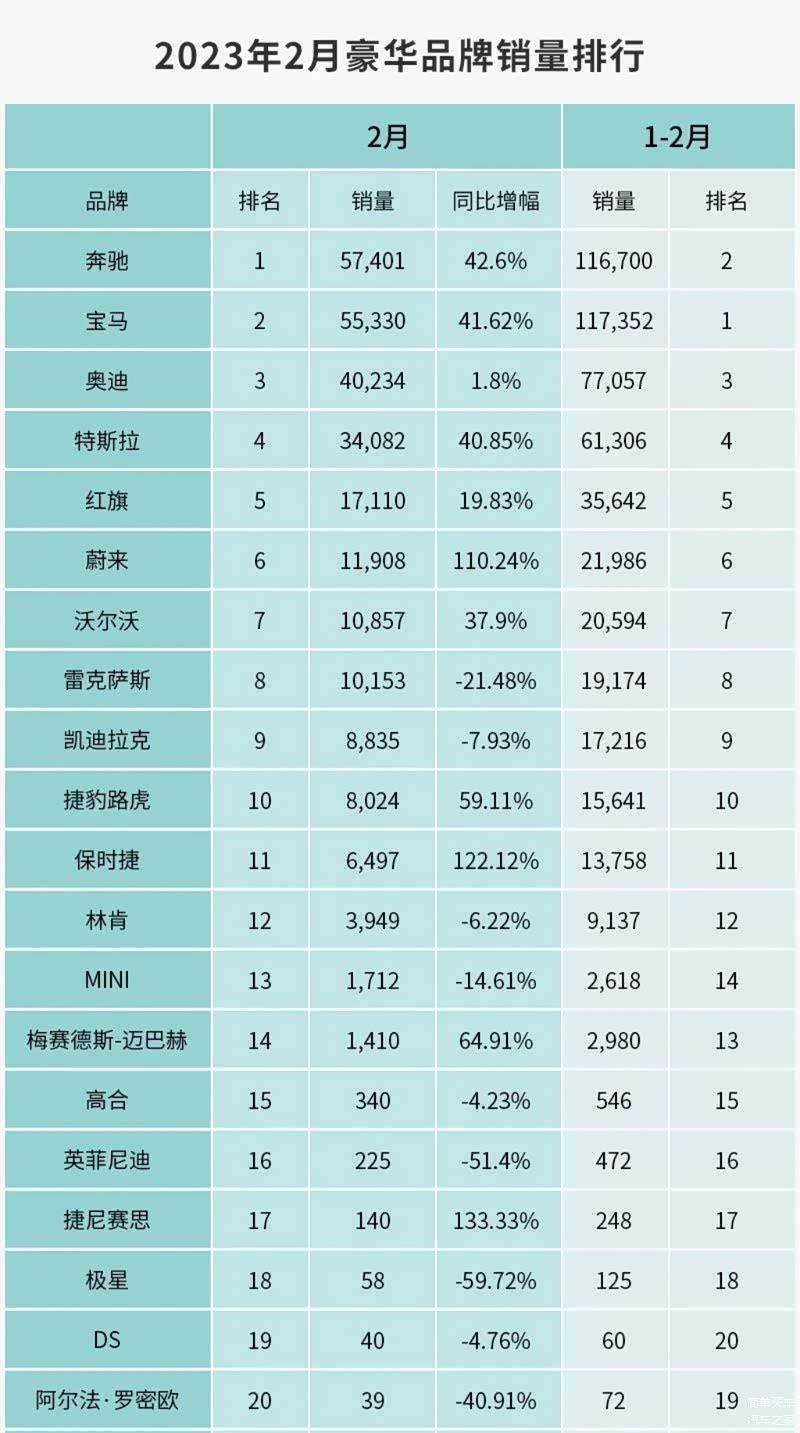 新能源汽车对二线豪华品牌造成的冲击,从销量也可以看出,2月份特斯拉卖出了3.4万辆,理想和蔚来的销量均超过了万辆,它们的销量已经超越了上面提到的这几个二线豪华品牌。此外,还有问界、极氪、腾势等高端新能源汽车品牌,它们的声量虽然要小一些,但也都是从传统豪华品牌手里抢蛋糕的搅局者。可怕的是,这些高端新能源汽车的销量仍在持续增长,不断吞噬着原本属于传统豪华品牌的高端市场。